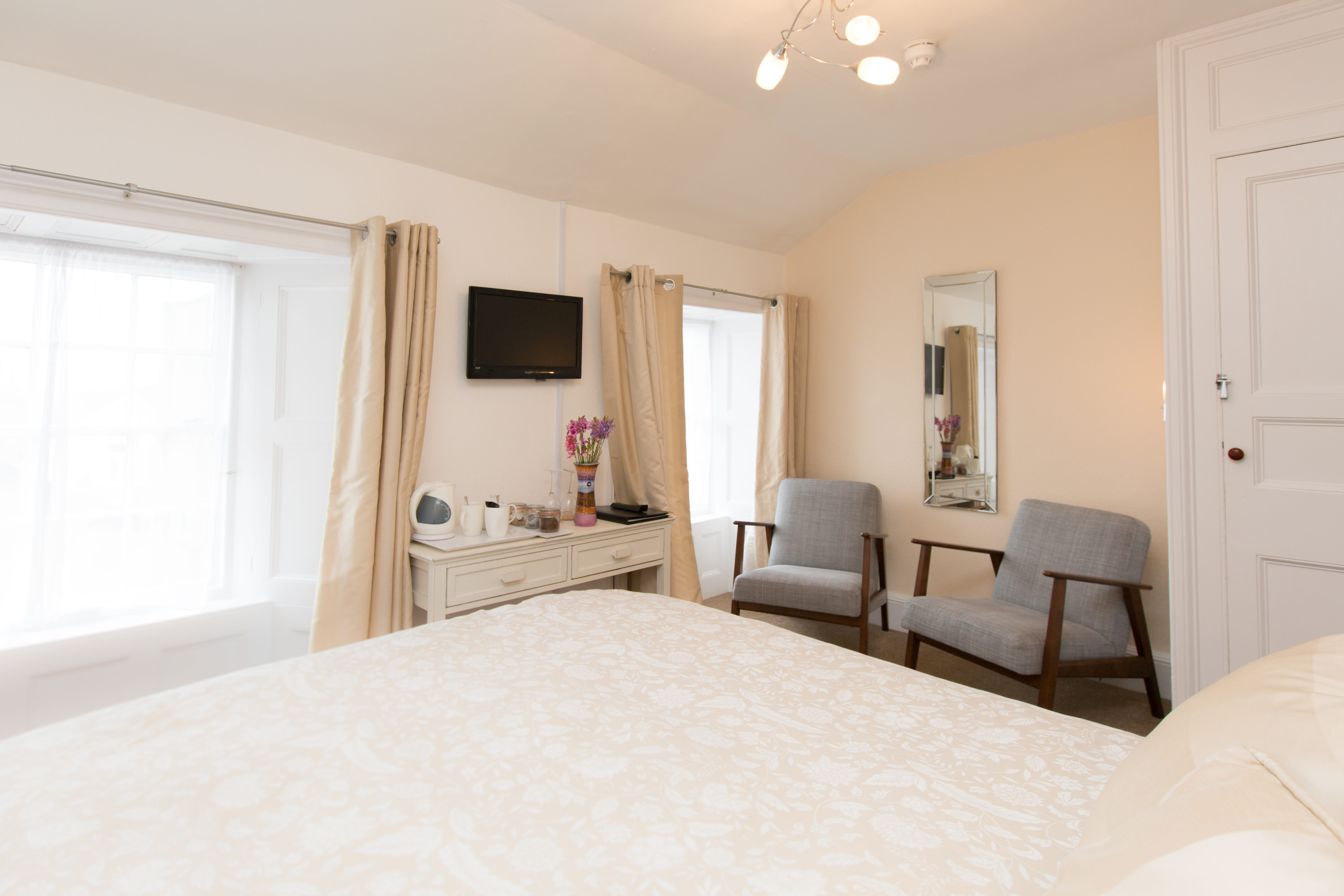 This double en-suite bedroom is at the top of the house. It is a spacious room and has a seating area, lots of storage and glimpses of Tresco and Samson through both its windows.